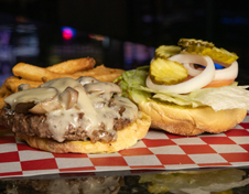 Mushroom 'N' Swiss Burger $10.99 - 1/2lb. USDA hamburger topped with fresh sauteed mushrooms & melted Swiss cheese.