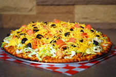 Taco Pizza - Chuncky Salsa & Spicy Beef topped with Crisp Lettuce, Tomato, Onions, Black Olives, Sour Cream & Shredded Cheddar Cheese